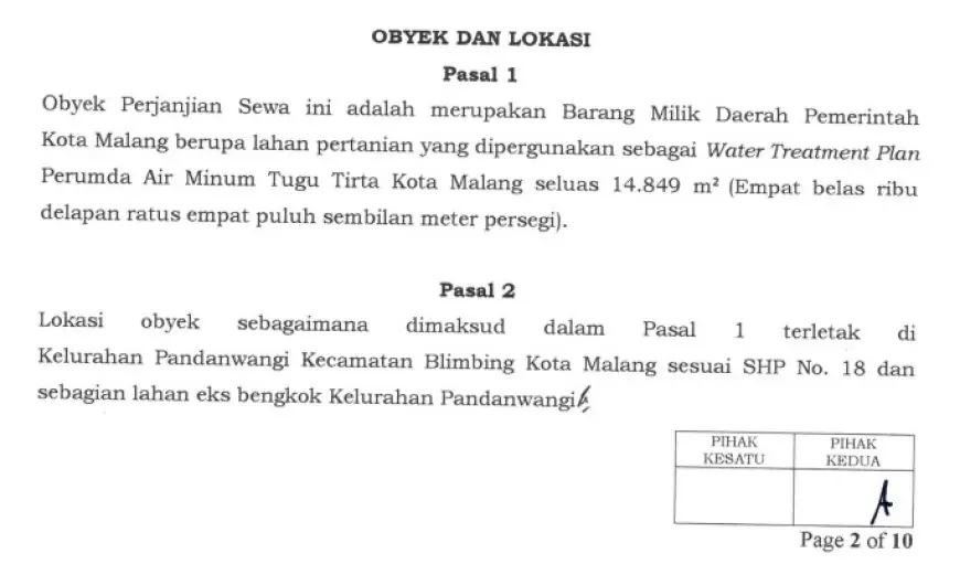 Dalam konstruksi hukum, penyewa dalam perjanjian tersebut adalah PDAM Tugu Tirta sebagai BUMD, sementara pihak yang menyewakan adalah Pemerintah Kota Malang melalui Sekda.