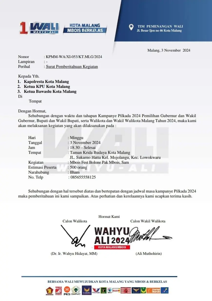 Surat pemebritahuan kampanye WALI yang dibuat tanggal 3 November 2024 serta pelaksanaan di hari yang sama