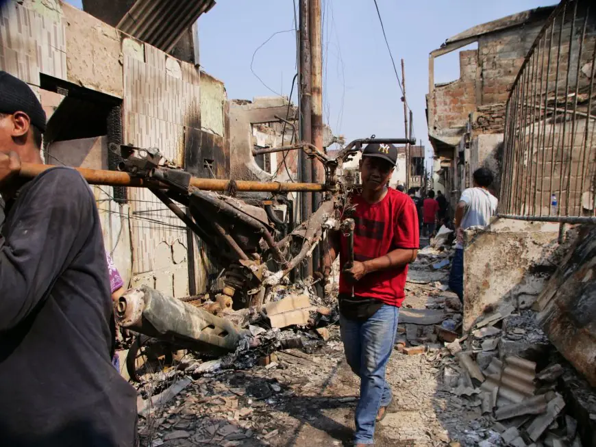 Dua warga korban kebakaran mengangkut rangka sepeda motor yang terbakar untuk kembali di jual ke pelapak besi yang telah menunggu di daerah Kampung Bali, Manggarai, Jakarta Selatan. Pengumpul besi membantu warga membersihkan puing-puing besi dari rumah yang terbakar dan membayar ala sekadarnya untuk memenuhi kebutuhan hidup pasca kebakaran melanda. (foto: An Mei)