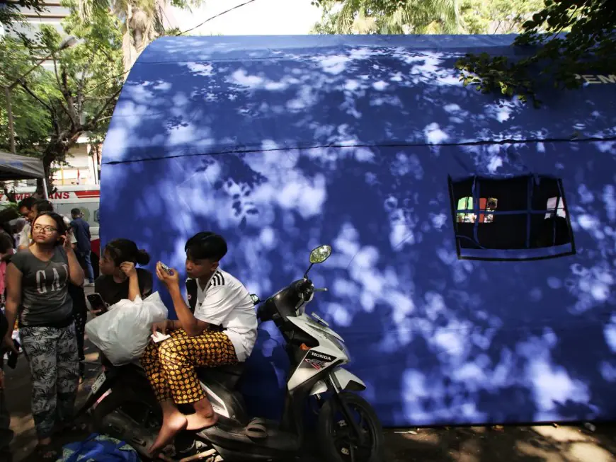 Anak remaja bermain gadget di depan tenda Dinas Sosial . Sebanyak 1000 KK yang tersebar di RW 06 jumlah 15 RT dengan 750 KK, 2.888 jiwa. Dan RW 12 jumlah 6 RT dengan 300 KK, 1.331 jiwa menjadi korban kebakaran yang di akibatkan konsleting listrik dari handphone yang di isi daya. (foto: An Mei)